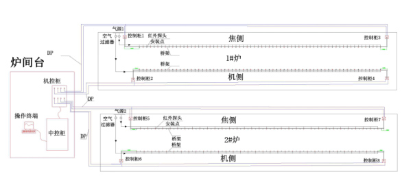 The installation of 1 # furnace infrared thermometer in the figure above is a schematic diagram of the full installation of the thermometer. There are 4 control cabinets on the coke side and the machine side of the furnace end table and the furnace table. There are 102 temperature measurement points in each furnace. (For example, 51 thermometers on the focal side, "machine control cabinet 1" is connected to nearly 26, and "machine control cabinet 3" is close to 25, and the machine side is similar). At the same time, the air source or nitrogen source is connected to the furnace table and the end table. The air source needs to be equipped with 2 sets of air filters on the coke side, a total of 4 sets of air filters. The air source and nitrogen source can be automatically switched. Backside infrared thermometer.