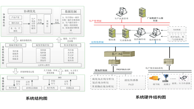 本系統(tǒng)從焦化一體化智能控制平臺出發(fā),主要包含脫硫子 系統(tǒng)、硫銨與蒸氨子系統(tǒng)、粗苯子系統(tǒng)及底層設備控制子系統(tǒng), 對關鍵參數(shù)進行智能預測與控制,對底層設備進行聯(lián)鎖操作與 狀態(tài)診斷,通過協(xié)調(diào)優(yōu)化,實現(xiàn)底層設備自動控制、過程環(huán)節(jié) 穩(wěn)定控制、上層管理協(xié)調(diào)優(yōu)化,達到優(yōu)化生產(chǎn)過程、降低成本、提高管理水平的目的。